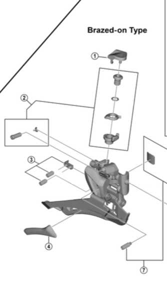 気分の問題というより、FD6800アームがタイヤに当たる可能性を避けたいという理由がありました。ということでR8000を導入。「FDにあるマーカーの指定位置まで調整ボルトを締め込めば、ワイヤー側での調整は不要」とか言われていましたが、そこまでインナーを引っ張るのは結構大変なので、ワイヤー調整アジャスターは有った方がいいと思います。それよか当初、ワイヤーを後方へ逃がすトップキャップを紛失してしまい(汗)、しばらくワイヤーの余りをシートチューブにドラテで張ってごまかしていました。パーツの供給は9月に入ってからだったので、市場に出回るのを待って購入。ちなみにFD-R9100用パーツとして売られているものですが同じです(下の図の1)。